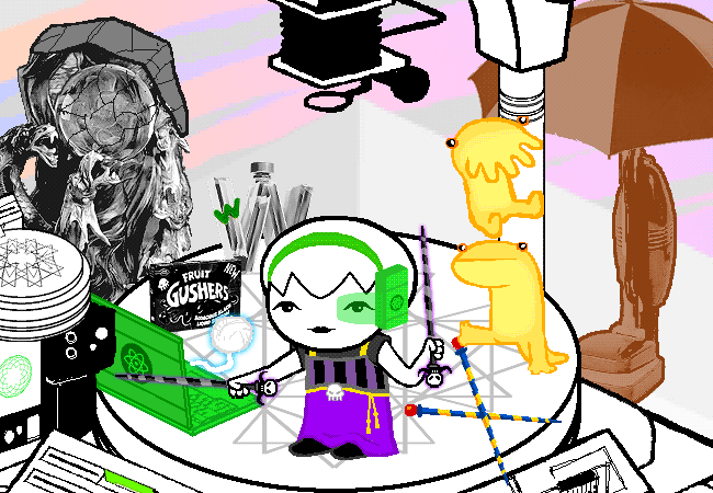 There are two ways to combine cards for the Alchemiter: "||" combine and "&&" combine. The difference between these is merely the way you punch the card, || (the "OR" combine) means you punch a hole in the result card for every hole there is in either card, done methodically. The second && (the "AND" combine) means you merely line the cards up next to each other, so that anywhere that there's a hole in both there's a hole in the result card. Appropriately for AND combining, an && alchemy result will often demonstrate the functionality of both components – e.g. Dave's iShades can be a phone and a rad pair of shades – while an || alchemy result will typically have the functionality of only one of the components, but the form of the other – e.g. the Hammerhead Pogo Ride, which is just a pogo that happens to be hammer-shaped.