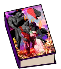 This unnamed trashy romance novel was used by Karkat to explain the subject of romantic vacillation to Dave. According to Karkat it's a pretty typical case of quadrant vacillation as applied to an overlapping group of romantic pairings. The two heroes in the middle, partaking in their flushed embrace are a typical lowblood redrom pairing. Their dynamic is the "grubloaf and tuber paste" of the overall story arc. The highblood male on the left is an old caliginous flame from the male lowblood's past, and has reentered the picture. The lowblood male can, of course, continue to court his matesprit and kismesis without conflict. It's a perfectly amicable arrangement that everyone's totally down with, until the two males start to have flushed feelings for one another, resulting in some red infidelity between the lowblood pair. Obviously this is where the fireworks start going off. The red feelings between the lowbloods turn to black, and thus begins quadrant vacillation. Meanwhile the two males are also vacillating between red and black, because they can't just let go of a rivalry so easily. During an especially black phase, the lowblood female waxes red for a notorious and especially brutal highblood female. So they have their thing on the side, but that inevitably starts vacillating too because the original pair just keep spinning like a top. Needless to say it is incredibly complicated and steamy. Rose steals the book almost immediately.
