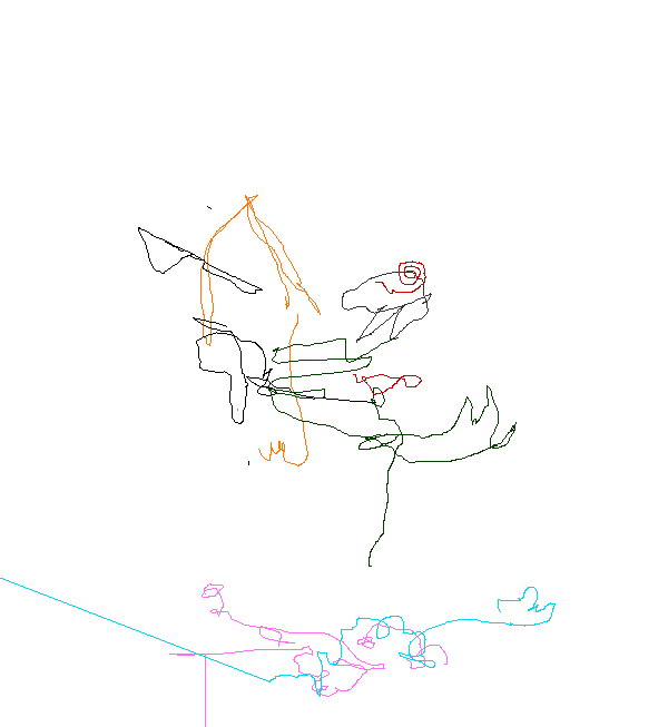 Caliborn's first attempt at drawing something. Top: Dirk, and Caliborn in some sort of green attire, with what appears to be a red bowtie and swirl mark. Bottom: Jane and Roxy possibly rendered in "giant snake form" in an attempt to seem pornographic.