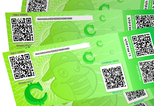 Cal Coins are an obvious parody of the bitcoin phenomenon; Hussie briefly considered establishing a real cryptocurrency to go with Cal Coin's appearance in the comic, but perhaps reasonably decided against it.[3] The QR codes on the Cal Coin bills are functional; the public address codes redirect to the MSPA website, one of the private keys just reads "HAA HAA HEE HEE HOO HOO (...)" and the cutout code contains a real Bitcoin key.