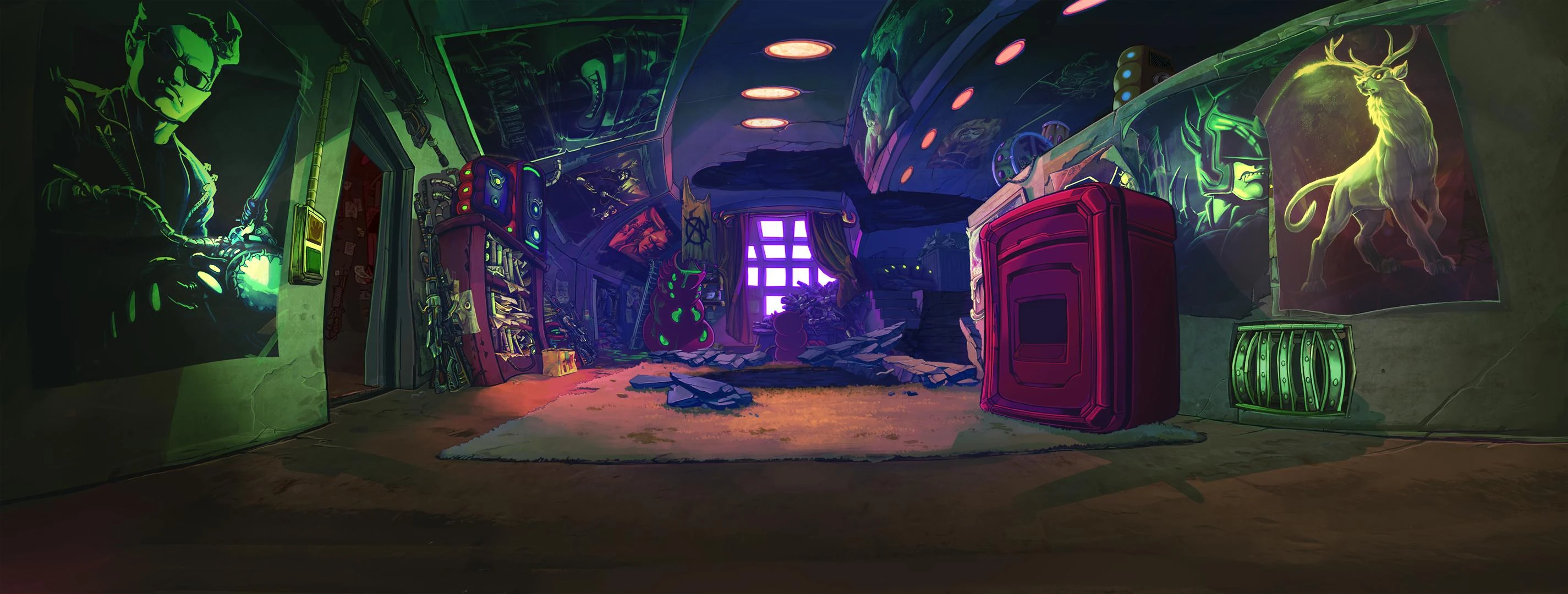 When Joey arrives on Alternia, she finds herself in Dammek's basement laboratory; it contains a second Cherub Portal, similar to the one found in Joey's attic in Half-Harley Manor. There is also a forklift, several crates, a storage elevator, a console and two large mechanical doors that, like most doors in Dammek's home, can be locked down. Through one of these doors is a bunker with a highly advanced computer and a wall of conspiracy theories, similar to Jude Harley's own in his tree house. Through this bunker is an air vent that leads to Dammek's Respiteblock.