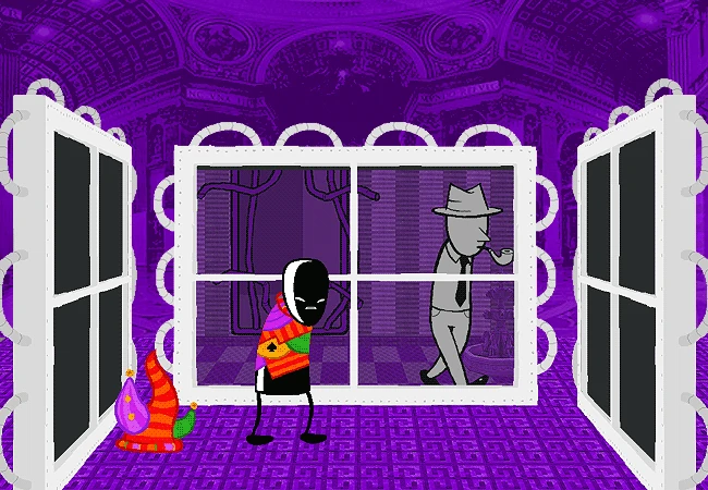 The Archagent of Derse finds similar use for a set of four fenestrated walls forming a “CUBICLE OF VIGILANCE”, allowing them to observe important goings-on throughout the Incipisphere. The fourth wall, however, as its name cheekily suggests, is actually connected to another window within the residence of Homestuck's author Andrew Hussie.