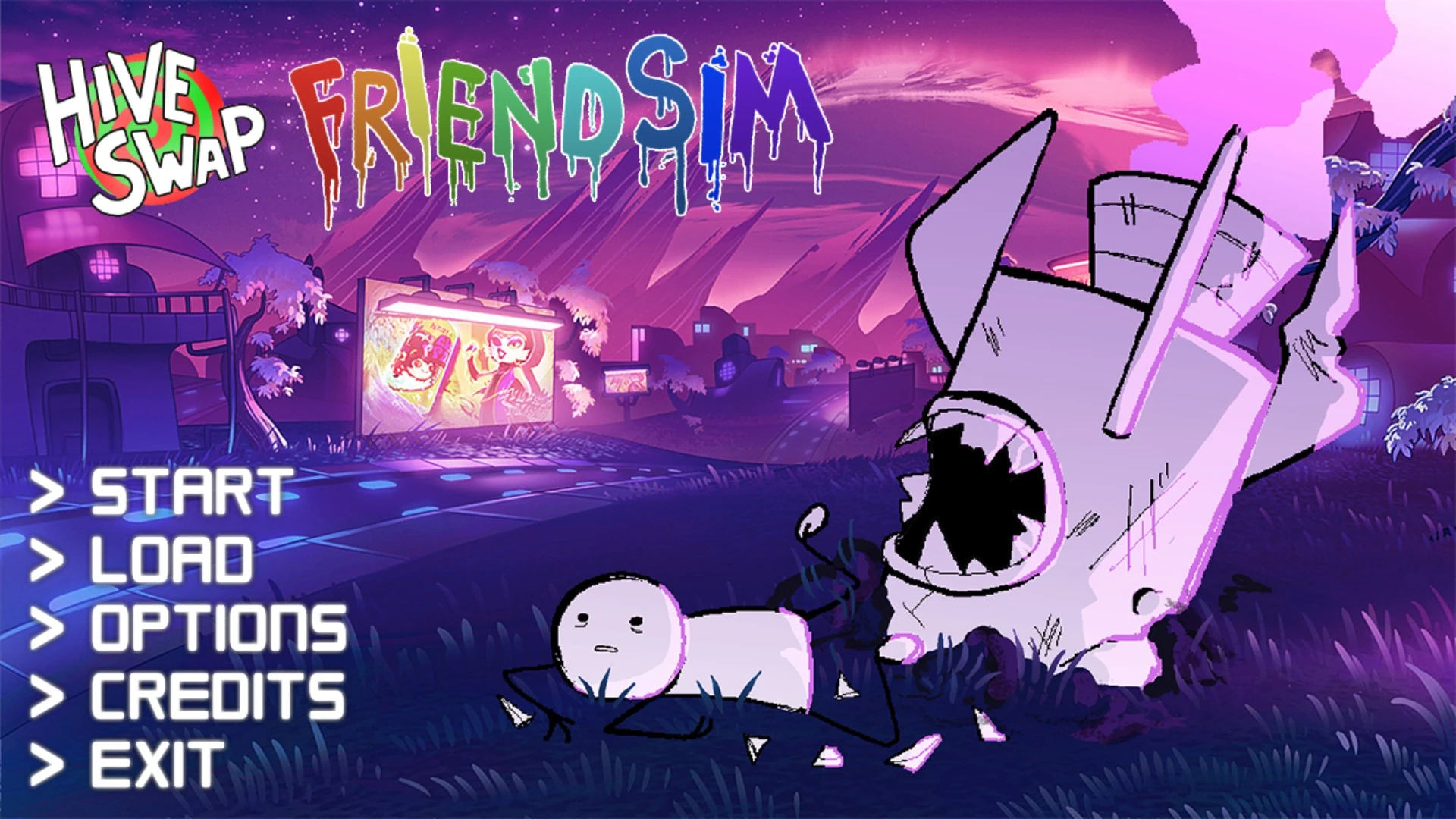 Hiveswap Friendship Simulator, Hiveswap Friendsim, is or just Friendsim a Hiveswap spinoff anthology of visual novels, written by a diverse group of writers, including Andrew Hussie, and primarily developed by David Turnbull in Ren'Py. The games are modelled on the style of the dating sim genre, styled as "friendship simulators" as the interactions had with the characters are platonic; this format follows in the footsteps of Andrew's previous dating simulator project featuring Homestuck characters, Namco High. The game features Hiveswap trolls first introduced by the Troll Call event, with whom the player interacts with in the persona of an unknown title character (potentially the MSPA Reader, acting as a nameless player substitute) who has crash-landed on Alternia. According to What Pumpkin, the format is a riff on the traditional dating sim; "The idea is, instead of trying to date a character, you just try to befriend them, and in the process, you get to know them better, and ridiculous things happen along the way."