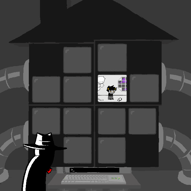 Spades deploys his war chest and finds a back-up hat with two black liquorice scottie dogs and numerous cards. He retrieves his Crosbytop from his War Chest and goes to mspaintadventures.com. The current adventure, from his timeline, is Homestuck. Spades then contemplates his vendetta itinerary and heist map.