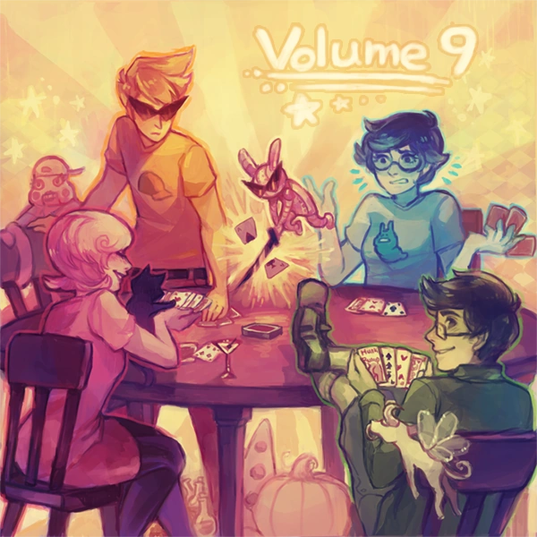 Homestuck Vol. 9 was the twenty-fourth Homestuck album released on Bandcamp on June 12th, 2012, available for a minimum of $11.11and assembled by Toby "Radiation" Fox. Between October 25th, 2019 and September 26th, 2025 it was available as part of the compilation Homestuck Vol. 9-10 (with [S] Collide. and Act 7).