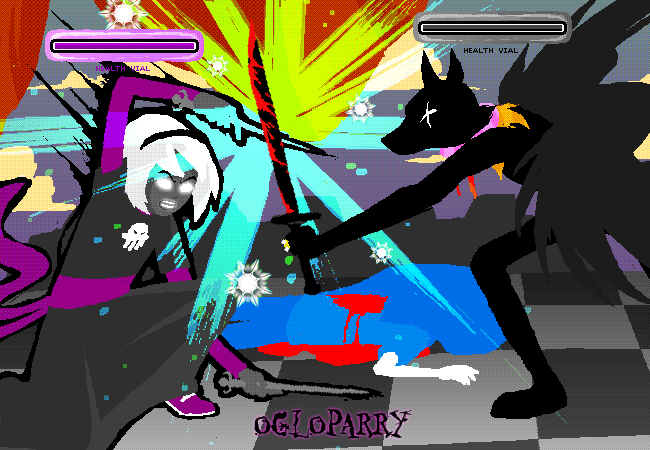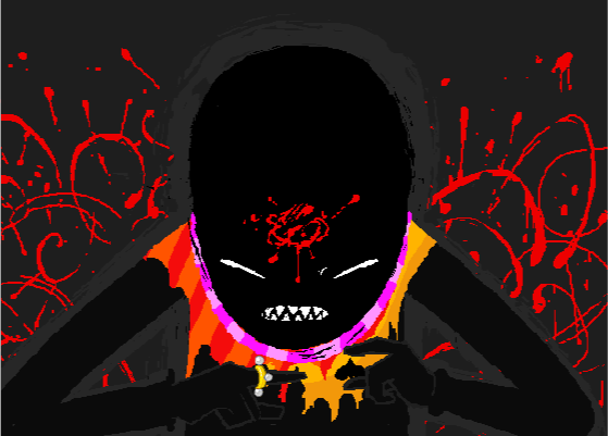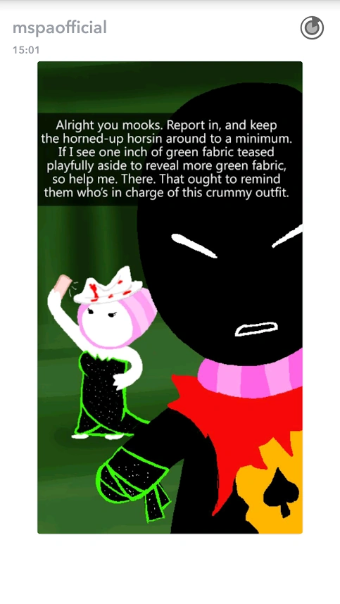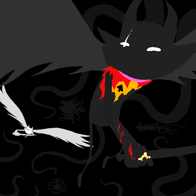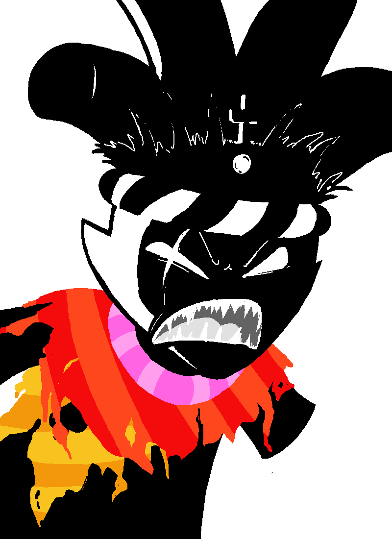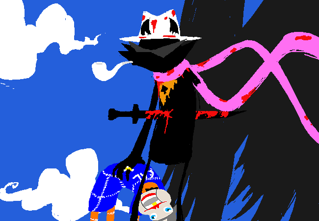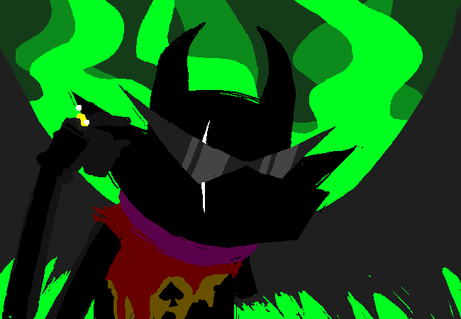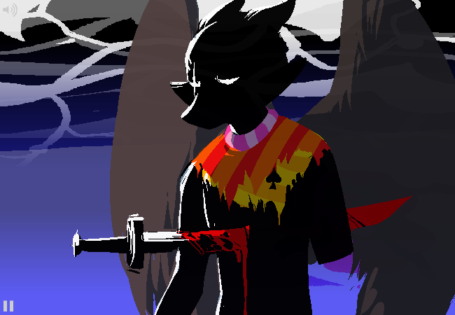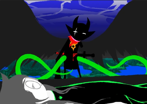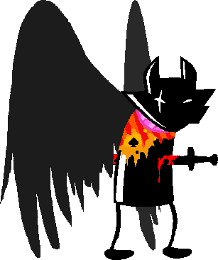 From there, he encroached on the Skaian Battlefield, performing a second coup de grace and interrupting the Warweary Villein's uprising, bisecting the Black King's scepter and decapitating the second member of the Derse royalty. He dons the Black King's crown and faces off with WV.