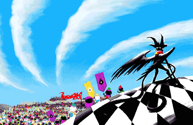 While Jack idled away doodling bitter artwork of the Queen on a parking ticket, the Black Queen appeared on one of his monitors. The Queen appeared in the room and demanded he wear his new, frilly, humiliating outfit. When Jack refused, she tried out a number of equally humiliating costumes on him, until Jack snapped and ripped off his jester garb.
