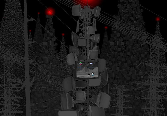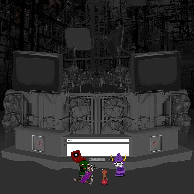 The MSPA command station is a signal broadcasting device located on future post-scratch Earth. It is similar in appearance and function to a radio tower, but is covered in several CRT monitors (at least 25) and is topped with a blinking red beacon bearing the MS Paint Adventures logo. At its base, there is a computer terminal, a smaller second tower covered in locks, and a power cord. A power source must be plugged into the cord to boot up the monitors; Gamzee Makara provides one in the form of a Skaianet hub.