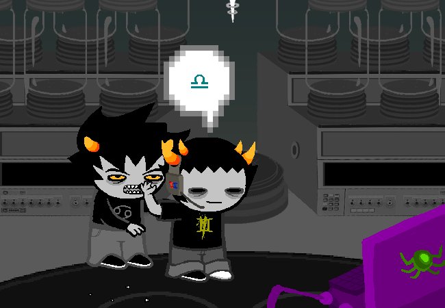 with Aradia before her robotic body explodes. Afterwards he spends most of his time with Feferi, “glubbing” about his feelings, until his dramatic rematch with Eridan