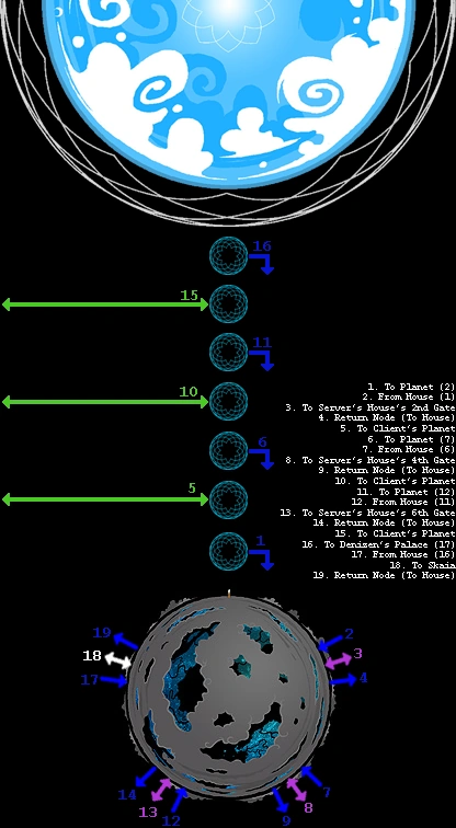 I think I messed up the progression somewhere but he will end up shooting out of his 6th gate above his house then progress through the 7th back into his land to his Denizen. In short, it's pretty much another reach-around type thing.EDIT: I DID screw up the progression.