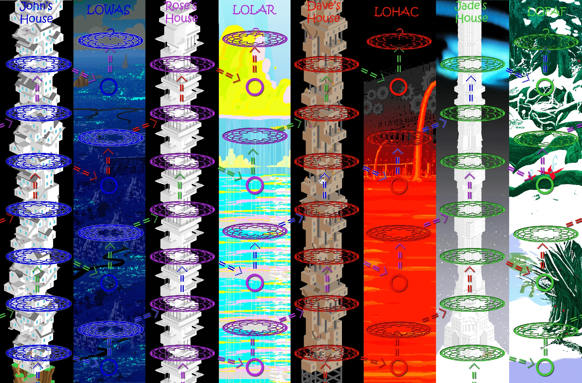 - Hey I am the one who made the above picture, why did you save it all shitty like that. Better quality below. This chart is completely correct, according to Davesprite's explanation of their workings, round robin style, with the 7th gate of each house going to where the land's denizen is. The gate layout here I'm pretty sure is correct, I just think that maybe who goes through which gates is up to the players, and probably doesn't matter too much. Had the kids followed the paths I made, each kid would actually end up fighting their client player's denizen. Maybe this is the correct way to play the game, who knows.