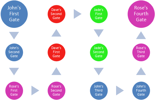 Is anybody else confused by the order/locations of the gates? I really don't get it. I mean, first of all, aren't the gate supposed to be layed out vertically? Why is John's second gate nowhere near his first? And I really don't get the whole "round robin" idea. I think a "Gate Order" page should be created to clear this up. Diacritical 04:05, April 18, 2010 (UTC)