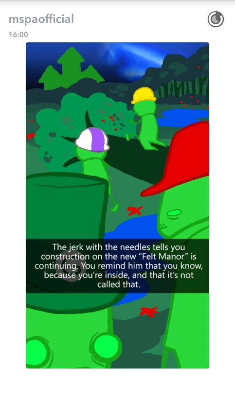by reaching to kill themself at the stump.[image?] How this timeline actually played out, and which specific stump this was, are unknown, though Andrew Hussie's commentary in the Homestuck books indicates that he believes the MSPA reader is one and the same guy "who, upon breaking out of jail, at some point became fixated on the idea of suicide in the proximity of this tree stump with a harpoon stuck in it."[2]