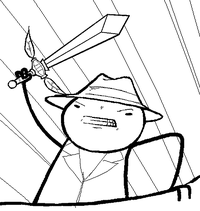 The Smith Corona Blotspitter is one of many holy weapons reserved for the exclusive use of the Chosen Arbitor and kept sealed away by the imaginary realm's nobility until the Arbitor needed it. That time comes when the Chosen Arbitor - Problem Sleuth after being transformed by Sepulchritude - does battle against Demonhead Mobster Kingpin. The Demimonde Semigoddess presents
